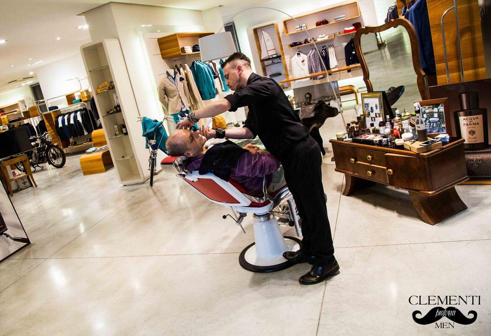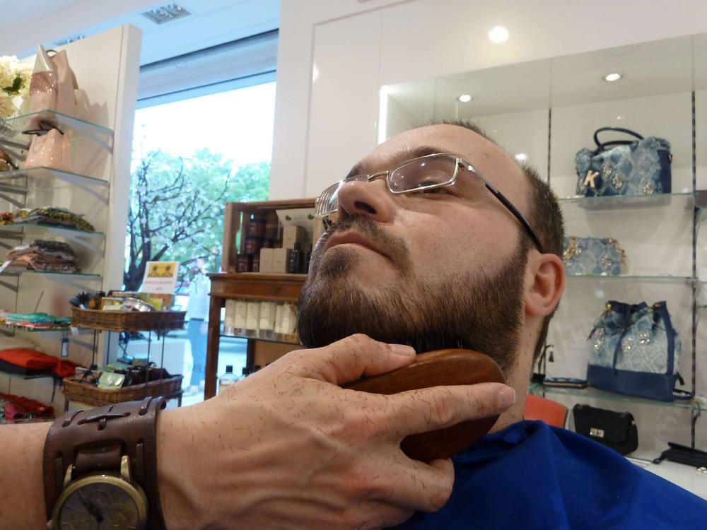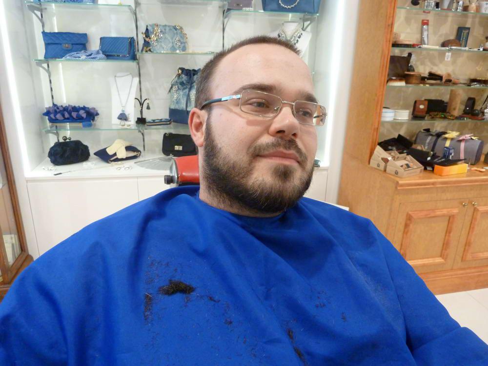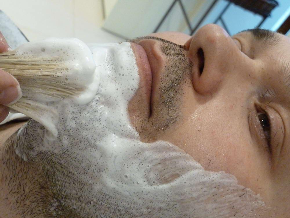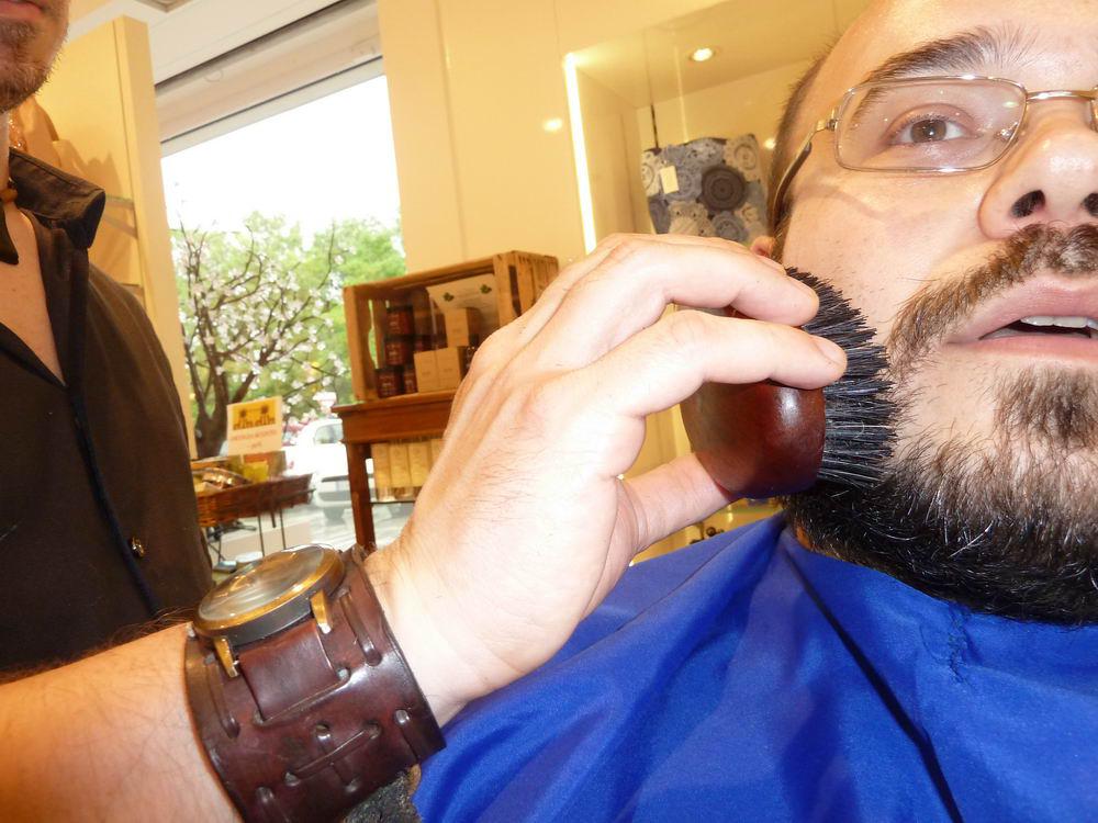 Poi è passato all’insaponatura a pennello, taglio e massaggio finale con un balsamo dopobarba.
