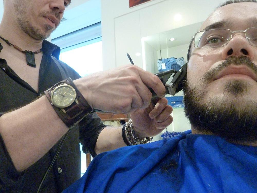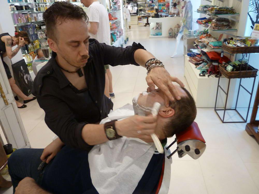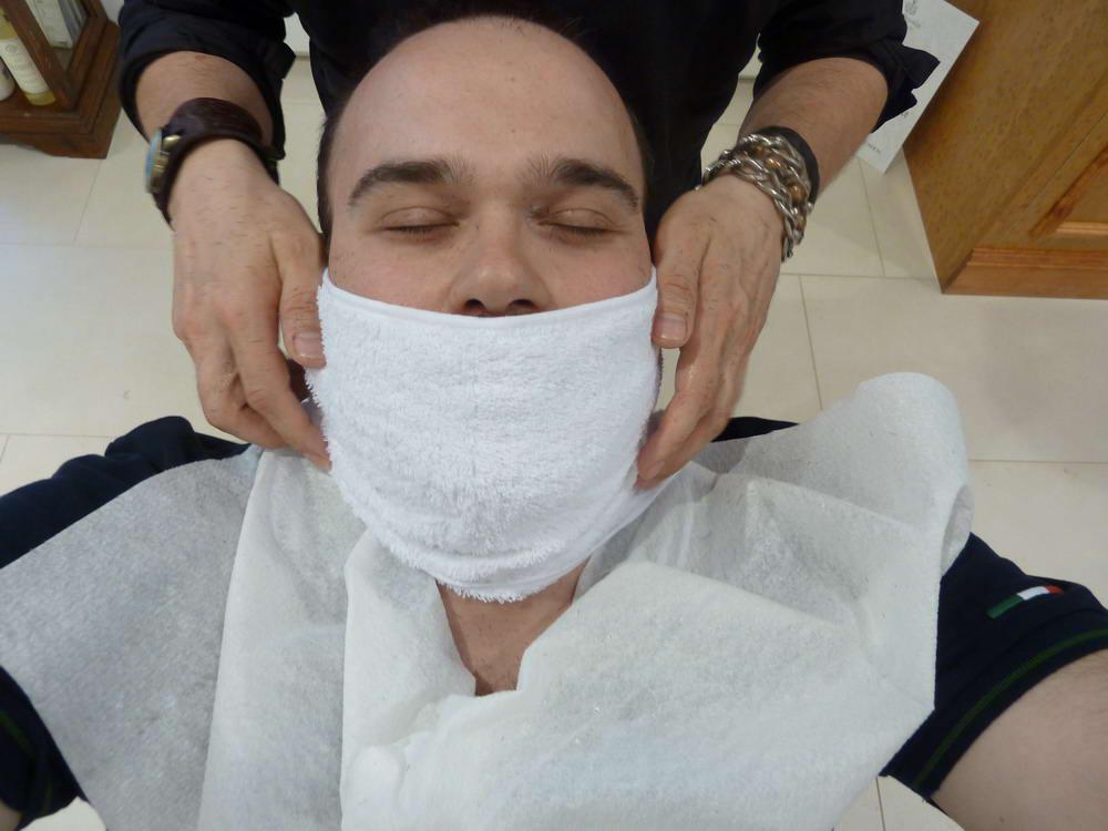 Il barbiere, Alberto, ha accorciato prima la barba con una macchinetta, ha scaldato il viso con un po’ di acqua calda, mi ha massaggiato (solo la faccia…) con del gel pre-rasatura e successivamente mi ha lasciato qualche istante con un panno caldo.
