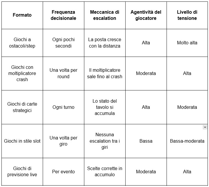 La tabella mostra dove si collocano i formati decisionali rispetto alle alternative. La combinazione di alta agentività ed escalation integrata – che i giochi a step e i formati crash condividono – produce livelli di tensione che i formati piatti semplicemente non possono replicare. I giocatori non sono semplici osservatori di un esito. Lo stanno costruendo attivamente, una decisione alla volta.